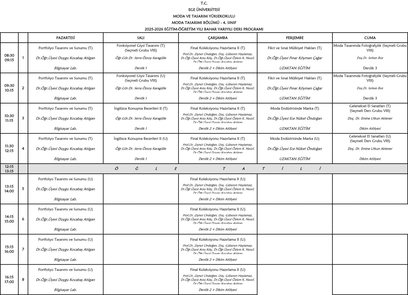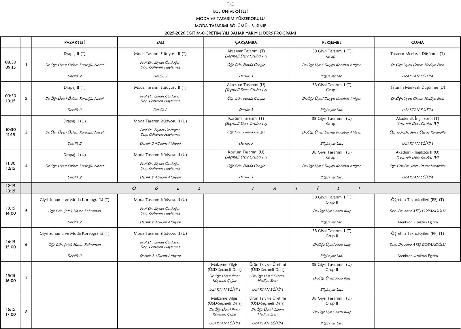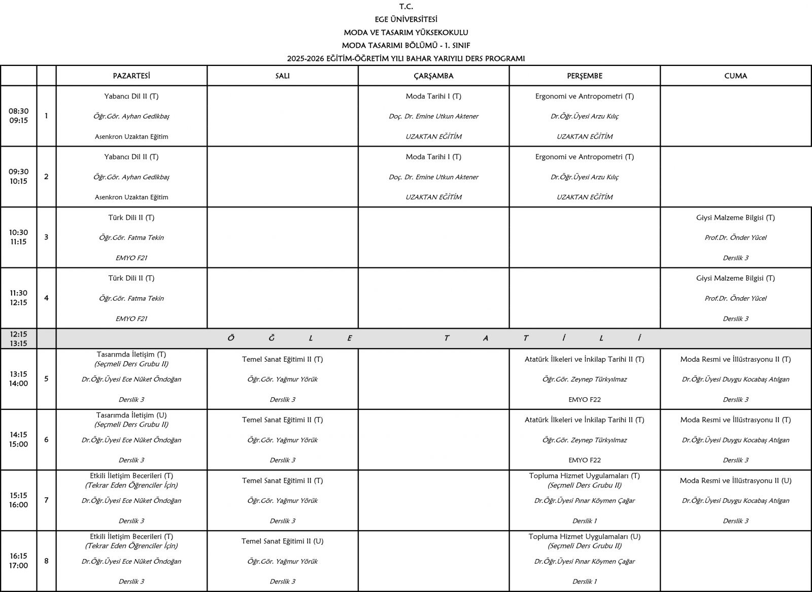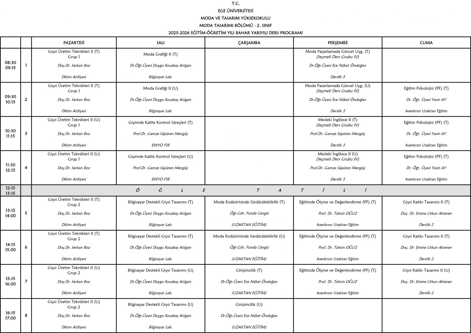 2025-2026 Bayar Yarıyılı Ders Programları - Moda Tasarımı Bölümü