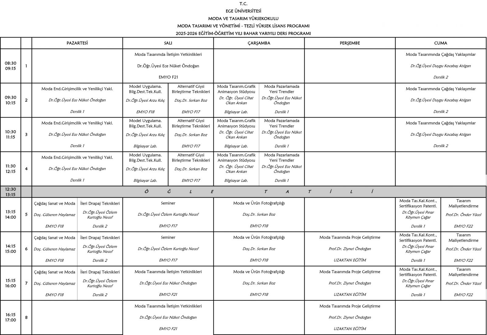 2025-2026 Bayar Yarıyılı Ders Programları - Moda Tasarımı ve Yönetimi Tezli Yüksek Lisans Programı